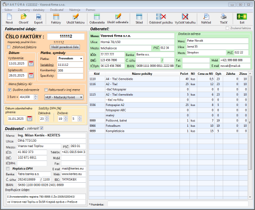 Veobecne o programe Softvr je uren na zostavovanie, archivciu a tla faktr v systme Windows. Umouje vies skladov evidenciu poloiek, vytvra zoznam zkaznkov a vytvoren faktry uklada do databzy, o vrazne zlepuje prehad o vydanch faktrach. Vstupn dta s prehadne usporiadan na formulri pre jednoduch a rchlu obsluhu. Samozrejmosou je uloenie osobnch dajov uvatea a pam pre naposledy pouit slo faktry. Podrobn nvod k obsluhe njdete v npovede. Nechba ani monos nastavenia aktulnych sadzieb DPH, alebo vytvranie faktr ako neplatca DPH. Nechba zava na poloku, dodacia adresa, export do formtu PDF, monos dulne zobrazi alebo priamo faktrova v inej mene ako € (CZK, PLN, USD,..) a evidencia skladovch poloiek. Aktulna verzia Okrem zmeny nzvu oproti predolej verzii (PROFAK), pribudla storno faktra, 3 sadzby DPH, stav faktry, dtum hrady a rchly nhad.