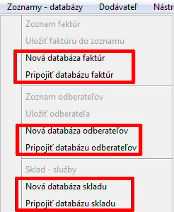 Intalcia - databzy Po spusten aplikcie budete upozornen na chbajce databzy "FAKTRY", "SKLAD" a "ODBERATELIA". Ak vykonte aktualizciu, vae nastavenia zostan zachovan. Aktualizcia sa vykon rovnakm postupom ako intalcia. V menu "Zoznamy-databzy" si vyberte monos vytvori nov resp. pripoji existujce prslun databzy.