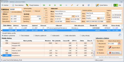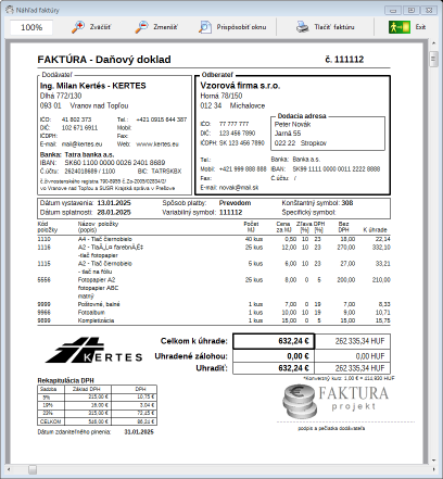 Vzhad faktry Oproti predchdzajcej verzii dolo k miernej zmene vzhadu faktry. Tak ako vyaduje nov legislatva pribudla tretia sadzab DPH v rekapitulcii DPH. Mte monos do faktry vklada Vae logo a podpis (obrzok). Umiestnenie loga je zjavn na priahlom obrzku. Vzhad faktry si overte v nhade. Mnostvo poloiek resp. riadkov na jednej faktre zostalo zachovan, t.j. 30. Formt faktry je A4. Tla faktry a export do PDF formtu Tla faktry na formt A4 (kancelrsky papier) prebieha tandardnm spsobom. Export do formtu PDF je prstupn v hlavnom okne.